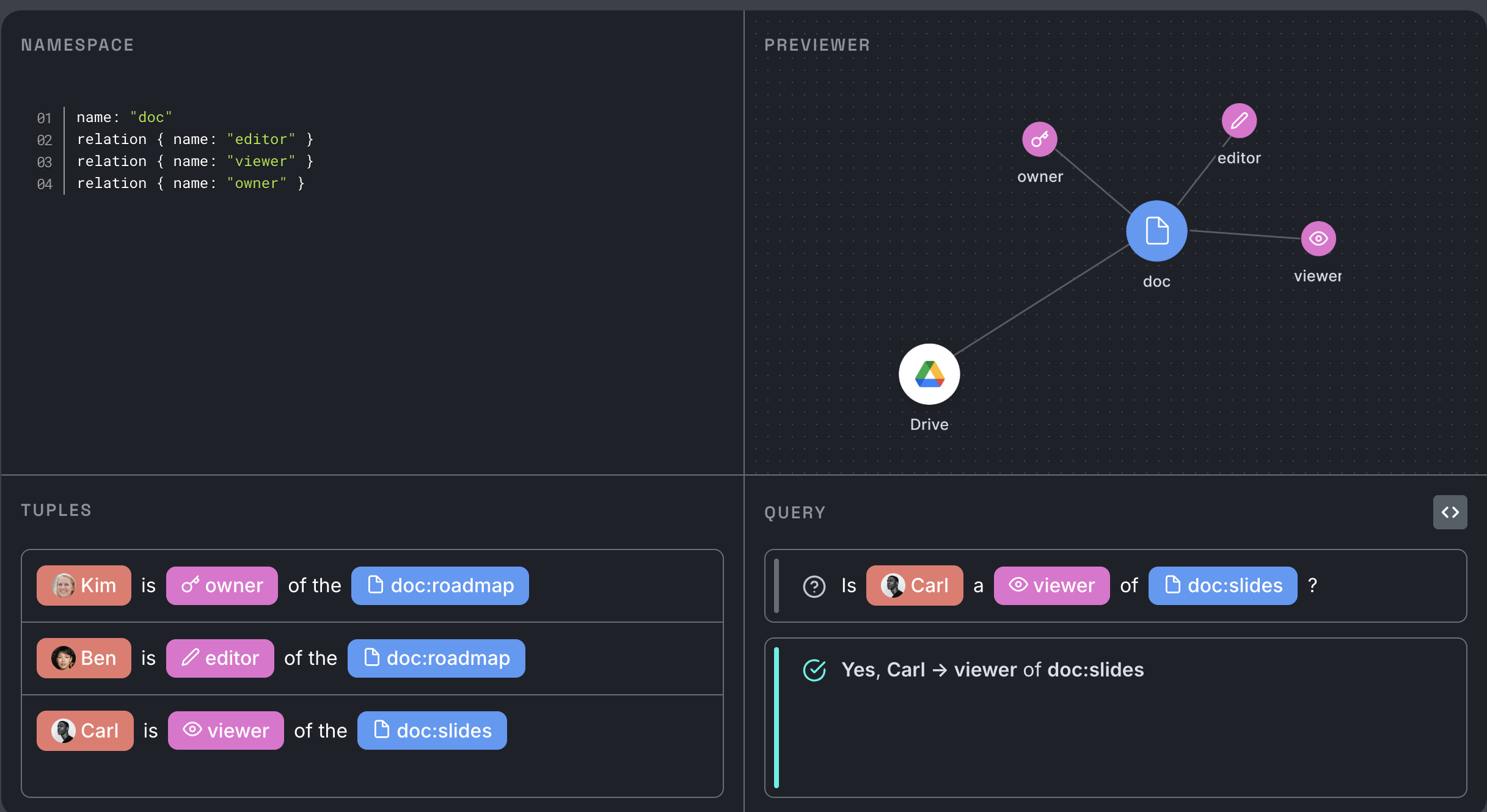 예: owner, member, shared_with, parent, manager_of, colleague_of - 정책(Policy): 관계 기반으로 정의된 접근 허용 규칙